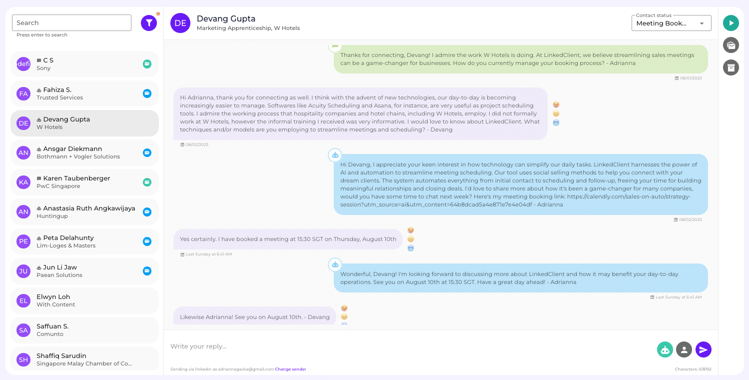 As you can see in the screenshots above, whenever a prospect sends you an email or a LinkedIn message, Elsie is there as your trusted assistant scheduling meetings on your behalf – completely automated and powered by AI.
